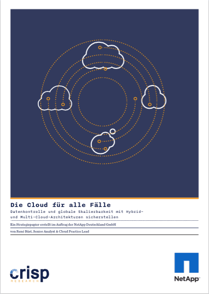 Vor diesem Hintergrund hat Crisp Research im Auftrag der NetApp Deutschland GmbH ein Strategiepapier erstellt, welches die Herausforderungen der Datenkontrolle und der globalen Skalierbarkeit im Rahmen von Hybrid- und Multi-Cloud-Architekturen thematisiert und Lösungsszenerien aufzeigt.