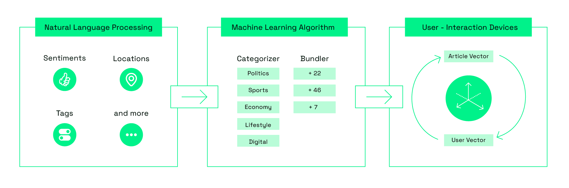Mit natürlicher Sprachverarbeitung und künstlicher Intelligenz sollen eingehende Nachrichtenartikel gefiltert, gebündelt und verstanden werden. Dann nutzen wir diese Informationen, um die Inhalte auf die Nachrichtenkonsument:innen abzustimmen.